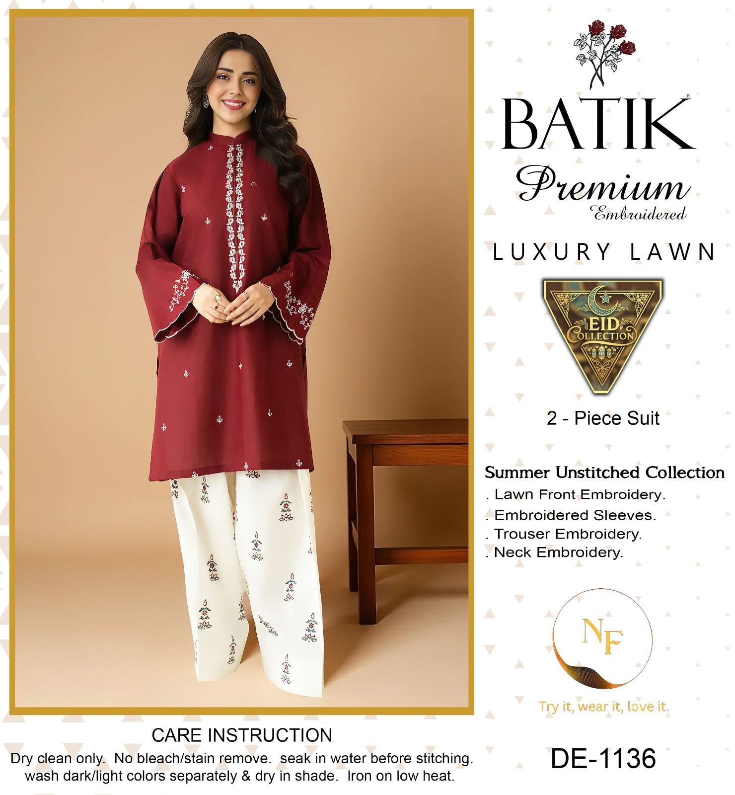 Step into elegance with the BATIK Summer Lawn Collection 2026. This beautiful 2PC embroidered suit is crafted from premium air-jet lawn fabric, offering comfort, breathability, and a luxurious look for the summer season. Inspired by the style worn by a gorgeous actress, this outfit blends fashion with high-quality craftsmanship.Step into elegance with the BATIK Summer Lawn Collection 2026. This beautiful 2PC embroidered suit is crafted from premium air-jet lawn fabric, offering comfort, breathability, and a luxurious look for the summer season. Inspired by the style worn by a gorgeous actress, this outfit blends fashion with high-quality craftsmanship.